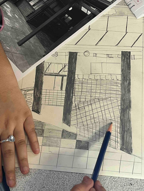 Delivered through Bow Arts, this Year 4 workshop introduced students to observational pencil drawing, inspired by their school and local buildings. Pupils explored perspective, scale, light and shadow, beginning with photographs and small-scale studies before moving outdoors to draw from their surroundings. Techniques included measuring with pencils, experimenting with texture and rubbings, and refining line and shading. The project also included a CPD element for teachers, supporting them to lead observational drawing activities independently. Students produced detailed, expressive drawings, building confidence, observational skills, and a deeper connection to their local environment.